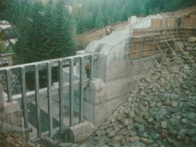 The primary debris barrier is one of the largest in the province at about 12.5 metres high, with a debris storage volume of 24,000 cubic metres. It consists of rugged structural steel grillage supported by mass concrete abutments. The steel grillage is sized to withstand the impact of a boulder two metres in diameter travelling at a velocity of up to five metres per second. During a major debris flow, most debris will be contained within a bedrock ravine behind the primary debris barrier, protecting the Whistler Creekside development.